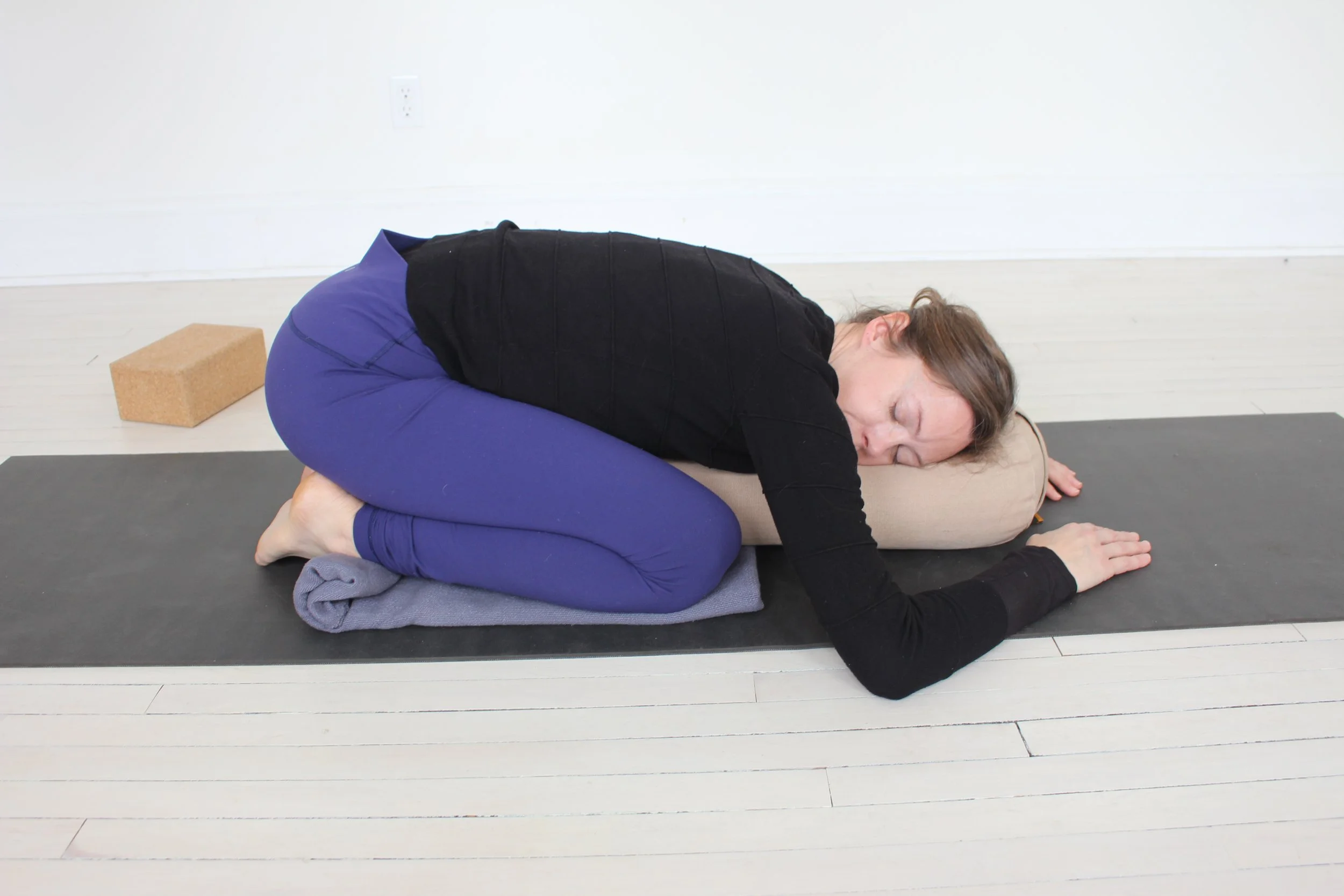 Restorative yoga, emphasizing physical support, minimal muscular effort, and receptive states that facilitate rest, repair, and autonomic settling.